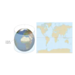 Note: Employs a cylinder as a projection surface. Close to the equator, where the curved surface of the cylinder comes into contact with the earth's surface (line of tangency), there are no distortions in the representation. As we move away from the equator, the deformation of the represented surface increases.