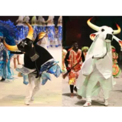 Explore more about The Parintins Folklore Festival , held annually in the city of Parintins, Amazonas, is famous for its bois-bumbás performances. On the last weekend of June, there is a competition between two rival oxen, the Boi Garantido (red and white) and the Boi Caprichoso (blue and white), who perform in their own "bumbódromos". The performances, elaborate and involving hundreds of participants, include dancers, singers, musicians and artisans, narrating folk stories from the region through theatrical performances, dances and traditional music. A jury evaluates each presentation based on criteria such as creativity, originality and musical harmony. In addition to the presentations of the bois-bumbás, the event features float parades, craft fairs, regional dances and musical shows...