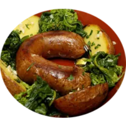 Alheira is a traditional sausage in Portuguese cuisine, with a famous version in Mirandela. It is a horseshoe-shaped smoked sausage filled with meat of different species, bread and seasonings. Supposedly, it was created by Jews in the 15th century in Portugal to disguise the consumption of pork, prohibited in the Jewish religion, in order to avoid persecution by the Inquisition. The recipe also ended up being appreciated by Christians, who added pork. Alheira is often grilled or roasted, served with side dishes such as potatoes, vegetables or rice, and is even enjoyed as an appetizer in some places, served with bread.
