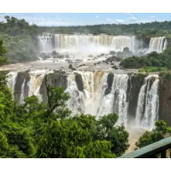 Las Cataratas del Iguazú, en Buenos Aires, Argentina, son una impresionante cascada de dos escalones formada por tres capas de basalto, con alturas de 35 y 40 metros. Situadas en la formación Serra Geral, su configuración está controlada por la resistencia del basalto vesicular. Las cataratas están divididas por numerosas islas, creando múltiples caídas de 60 a 82 metros de altura a lo largo de 2,7 kilómetros. Destaca la Garganta del Diablo, de 80-90 metros de ancho y 70-80 metros de profundidad, que absorbe la mitad del caudal del río. El cruce de corrientes de agua marca la frontera entre Brasil, Argentina y Paraguay, un atractivo turístico. La disposición de las cataratas forma una "J" invertida, con la Garganta del Diablo marcando la frontera entre Argentina y Brasil. La margen derecha pertenece a Brasil, mientras que las orillas de la izquierda son argentinas.