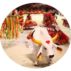 Explore more about The Parintins Folklore Festival , held annually in the city of Parintins, Amazonas, is famous for its bois-bumbás performances. On the last weekend of June, there is a competition between two rival oxen, the Boi Garantido (red and white) and the Boi Caprichoso (blue and white), who perform in their own "bumbódromos". The performances, elaborate and involving hundreds of participants, include dancers, singers, musicians and artisans, narrating folk stories from the region through theatrical performances, dances and traditional music. A jury evaluates each presentation based on criteria such as creativity, originality and musical harmony. In addition to the presentations of the bois-bumbás, the event features float parades, craft fairs, regional dances and musical shows...