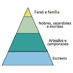 A sociedade egípcia era formada por vários grupos ou estratos sociais(sociedade estratificada), mas era também hierarquizada (quer dizer, de cima para baixo), ou seja, os grupos sociais estavam organizados de acordo com a riqueza, o nascimento, a função ou o prestígio de cada um. Cada estrato social detinha, poderes e funções diferentes. No topo estavam o faraó e sua família, responsáveis pela organização política do Egito. Os nobres, altos funcionários, sacerdotes e escribas formavam grupos privilegiados, dedicados a funções como culto religioso, administração e militares. Comerciantes, artesãos e camponeses, embora não privilegiados, trabalhavam para o faraó e pagavam impostos. Os camponeses eram o grupo mais numeroso e podiam ser deslocados para obras públicas. Os escravos, geralmente prisioneiros de guerra, realizavam os trabalhos mais duros e eram propriedade do faraó, sendo comuns na civilização egípcia.