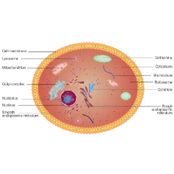 Células eucarióticas vegetal/animal: Com numerosos organelos.